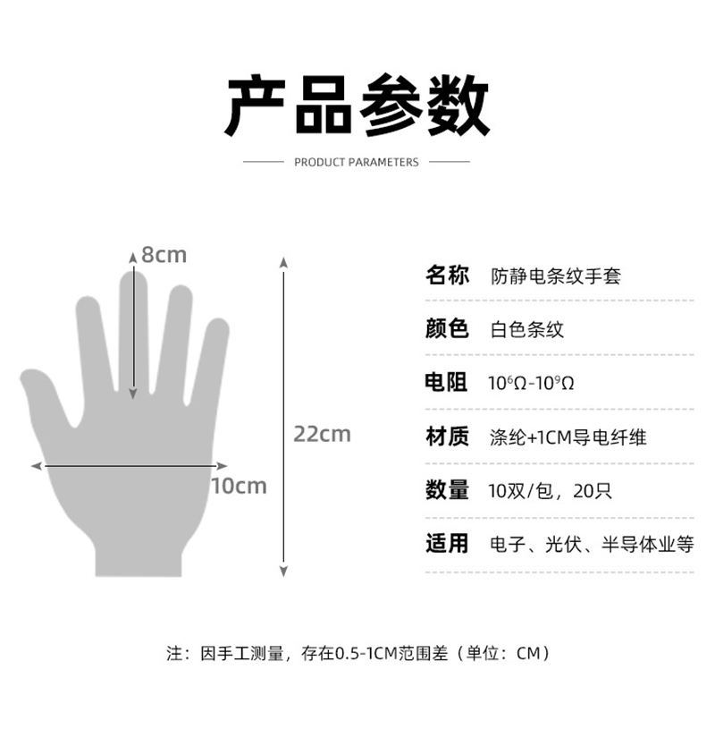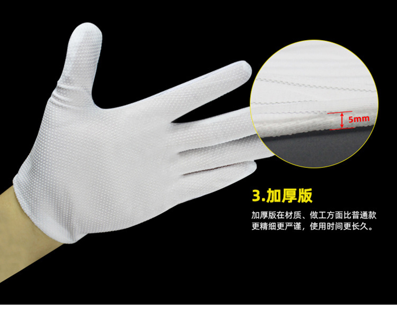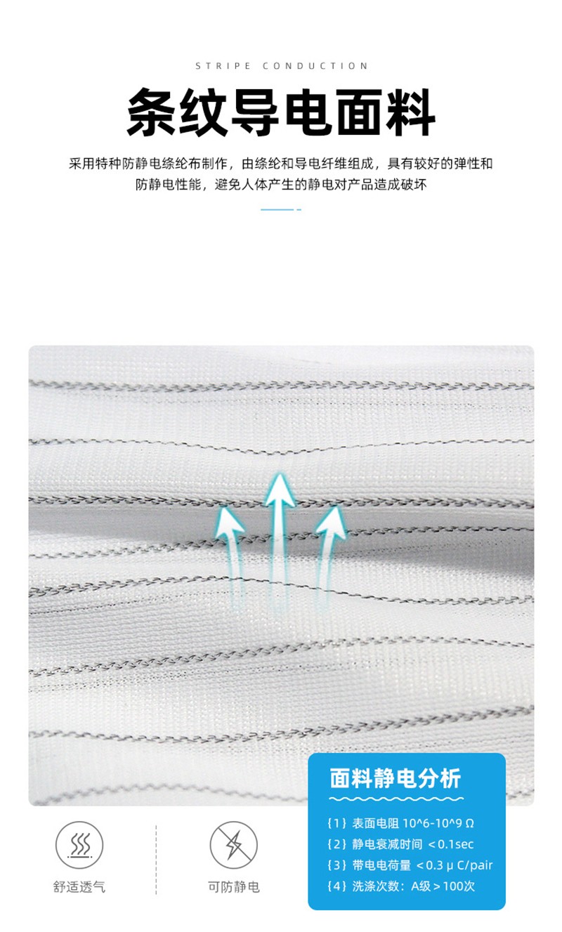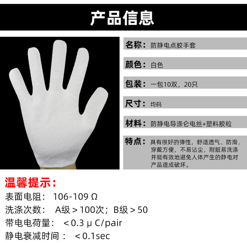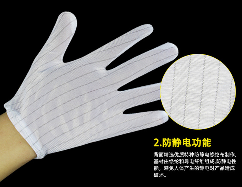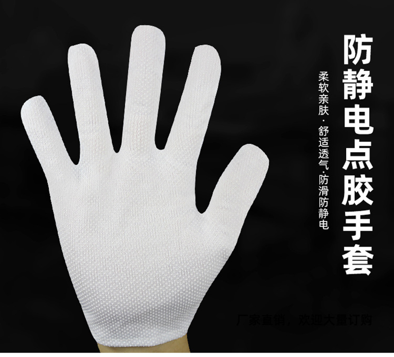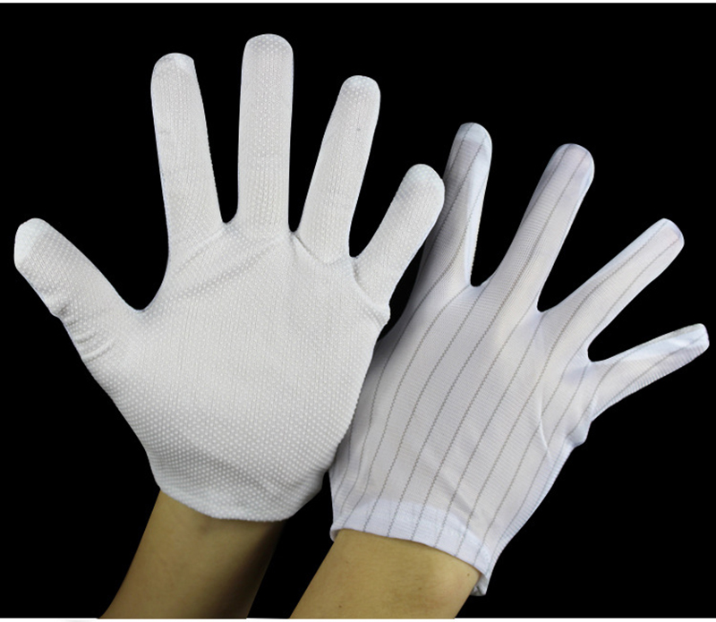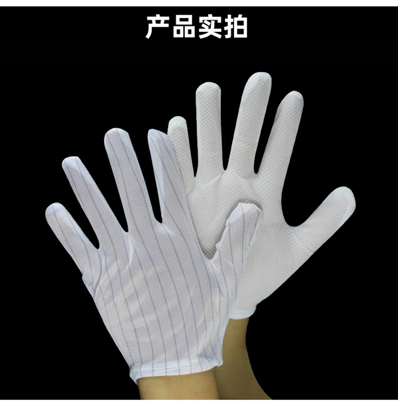 Performance: Made of polyester filament and Japanese bell spun conductive wire, high-quality anti-static fabric with a spacing of 10mm between conductive wires. The palm part is treated with PVC dots on the surface of the substrate. The gloves not only have excellent anti-static performance, but also have good anti slip and sweat absorption properties.