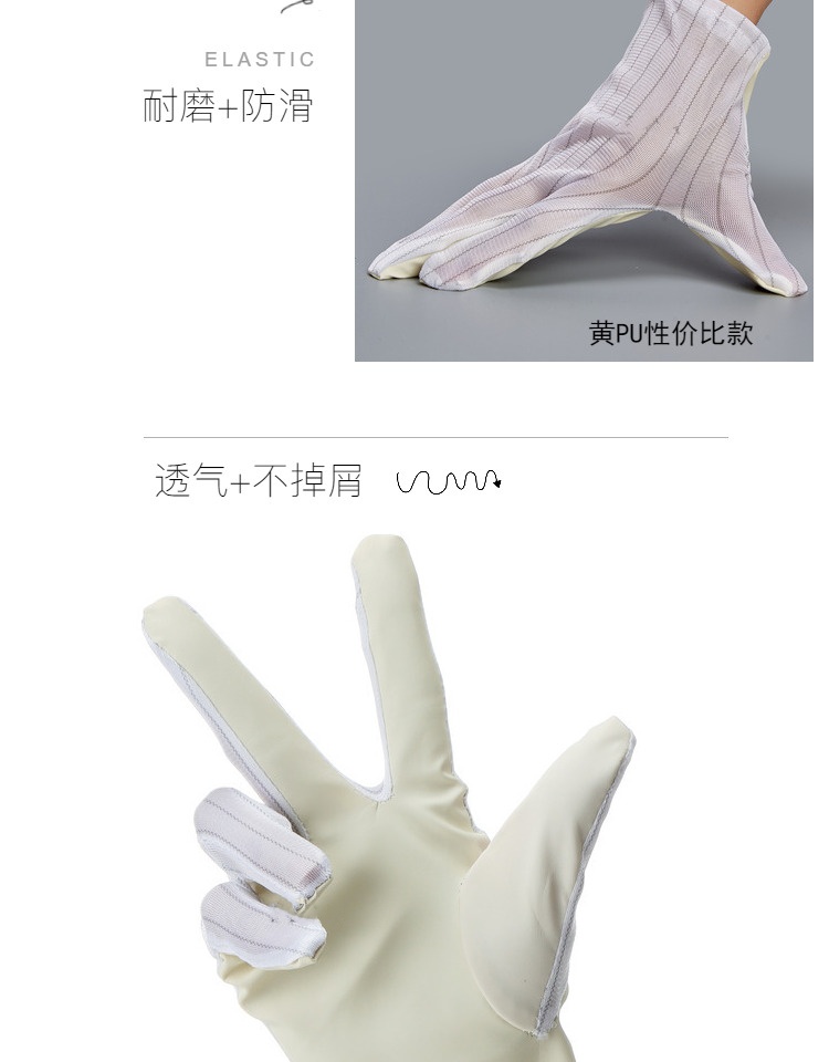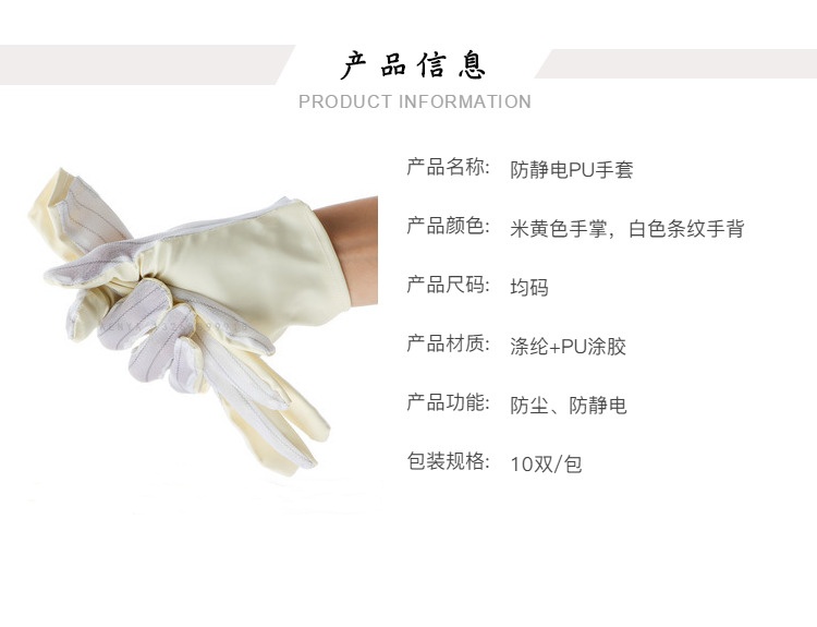 Performance: Made of polyester filament and Japanese bell spun conductive yarn, the gloves are made of high-quality anti-static fabric with a spacing of 10mm between conductive yarns. The palm part is made of PU sulfur free material. In addition to excellent anti-static performance, the gloves also have good anti slip and sweat absorption properties.